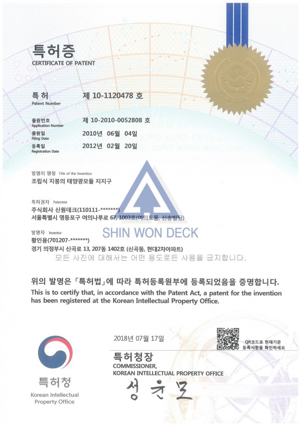특허증 | 조립식 지붕의 태양광모듈 지지구 페이지 정보 작성자 최고관리자 작성일18-09-27 16:09 조회1,304회 댓글0건 목록 본문 조립식 지붕의 태양광모듈 지지구 특허증입니다. 목록