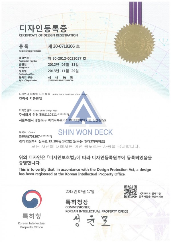 건축용 지붕판넬-2 디자인등록증입니다.