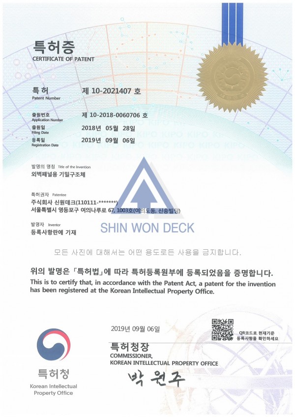 외벽패널용 기밀구조체 특허증 입니다.