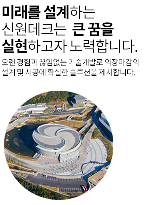 신원데크는 1980년 설립이래 오랜 전통과 경험을 바탕으로 외장기술개발에 힘써 왔으며, 현재는 겸허한 자세로 한발 한발 자신감을 갖고 전진하고 있습니다.